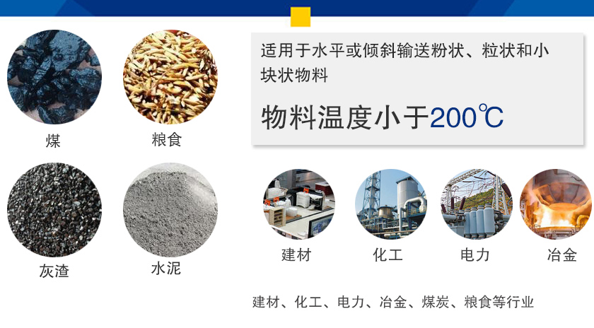 輸送物料:適用于輸送粉狀、粒狀和小塊狀物料,如煤、灰、渣、水泥、糧食等,物料溫度小于200℃。