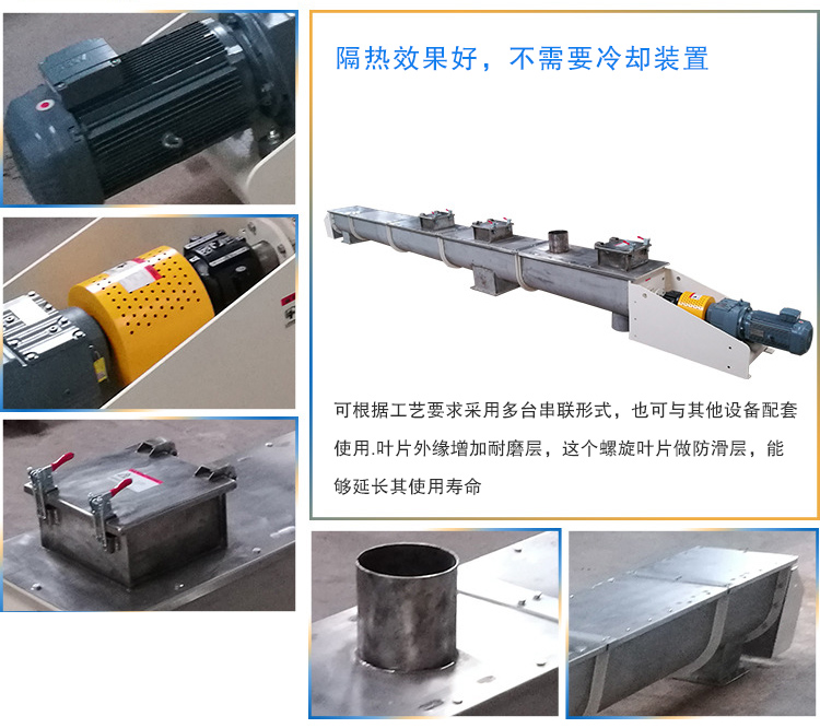 礦渣螺旋輸送機是由驅動裝置、螺旋、頭部軸承、尾部軸承、懸掛軸承、機蓋、底座等組成。驅動裝置:由電動機、減速器、聯軸器等組成。螺旋軸與吊軸承、頭部軸承、尾部軸承聯接采用嵌入舌式,安裝拆卸不需軸向移動,維修方便,采用變徑結構,增大吊軸承處的容積,避免吊軸承與物料接觸,各傳動部位采用浮動聯接方式,頭尾軸承座均在殼體外,所有軸承采用多層密封和配合密封技術,軸承使用壽命長。