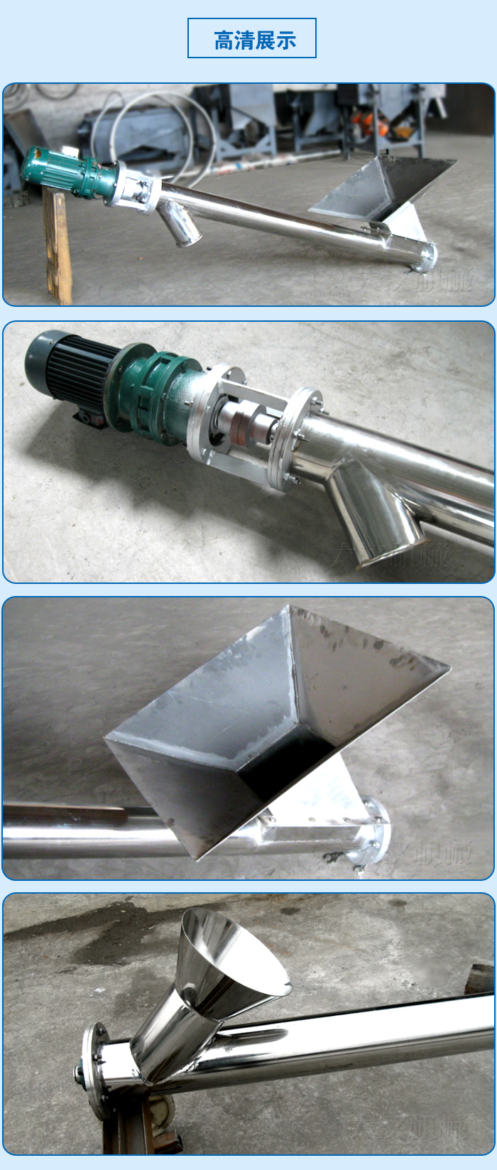 產(chǎn)品介紹 糧食螺旋輸送機(jī)對(duì)于衛(wèi)生環(huán)境要求較高,所以一般除了電機(jī)、軸承、機(jī)架外其余為不銹鋼制成,糧食螺旋輸送機(jī)可以用來輸送玉米、稻谷、食鹽、黃豆、面粉、淀粉等粉末或顆粒狀物料。輸送方式有水平式、傾斜式和垂直式三大類型,根據(jù)輸送物料的難易程度可以選擇螺旋葉片的設(shè)計(jì)(有軸和無軸),同時(shí)可以按照輸送現(xiàn)場(chǎng)要求在糧食螺旋輸送機(jī)上安裝滑輪。 產(chǎn)品細(xì)節(jié)